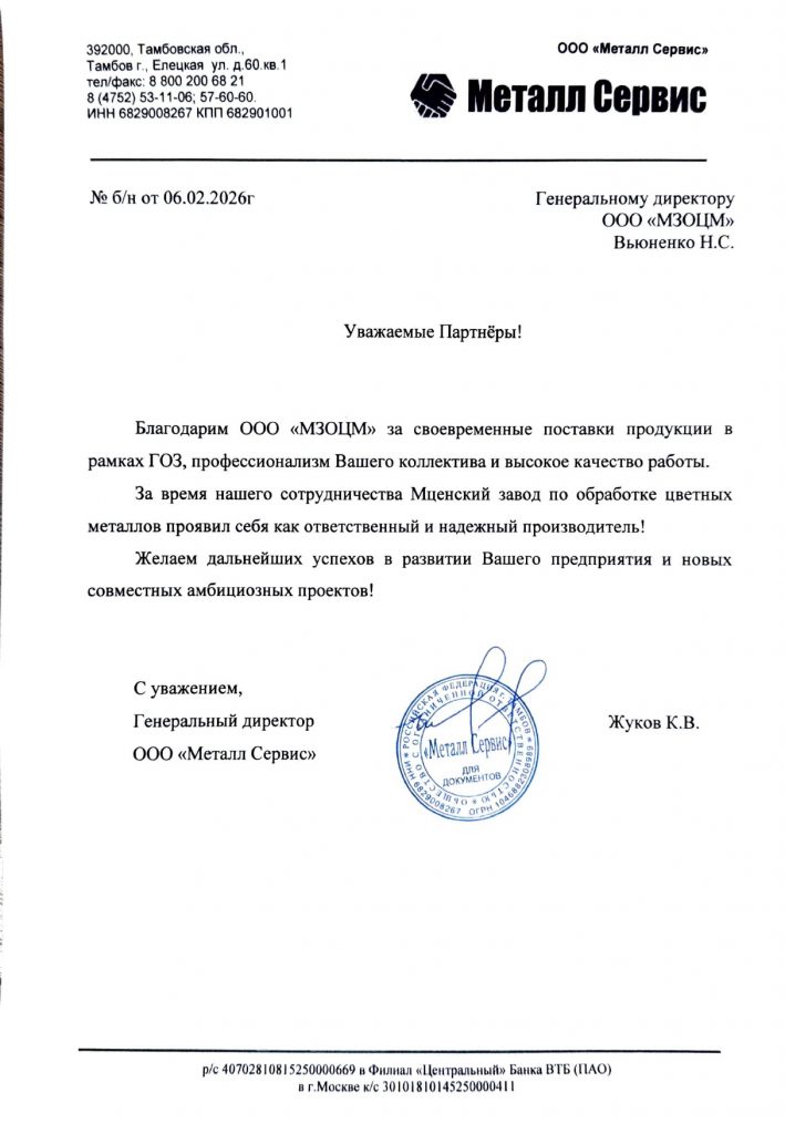 ООО «Мценский завод по обработке цветных металлов» (МЗОЦМ) благодарит коллектив и руководство