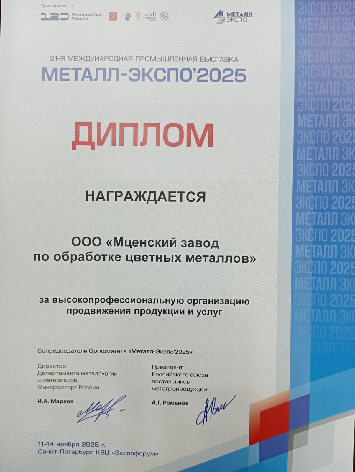14 ноября завершилось участие нашего предприятия в ежегодной выставке Металл-Экспо 2025.